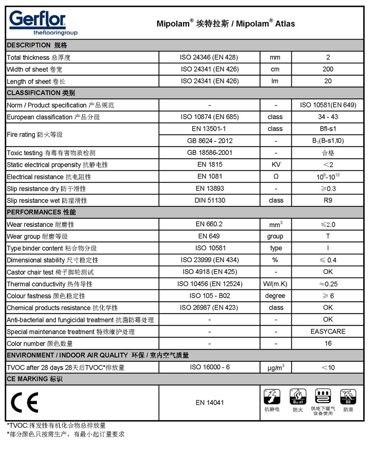 MIPOLAM?埃特拉斯具有抗菌和防霉的特點。該地板符合 EN 649 (34 - 43) 項規(guī)定,其耐磨性達(dá)到 Group T 的標(biāo)準(zhǔn),適合于人多量大的地方使用的。