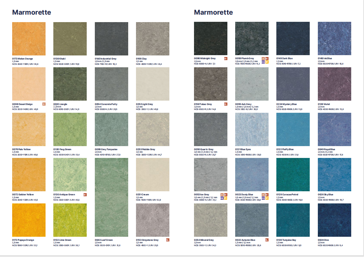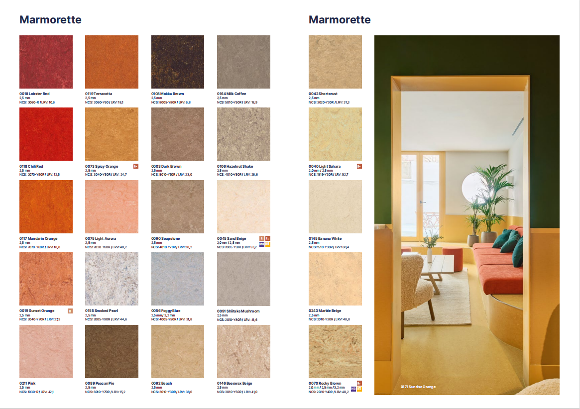 COLORETTE是一種壓延致密型的亞麻地板,2米寬,在日常交通流量繁忙的區(qū)域提供出色的抗磨損性。