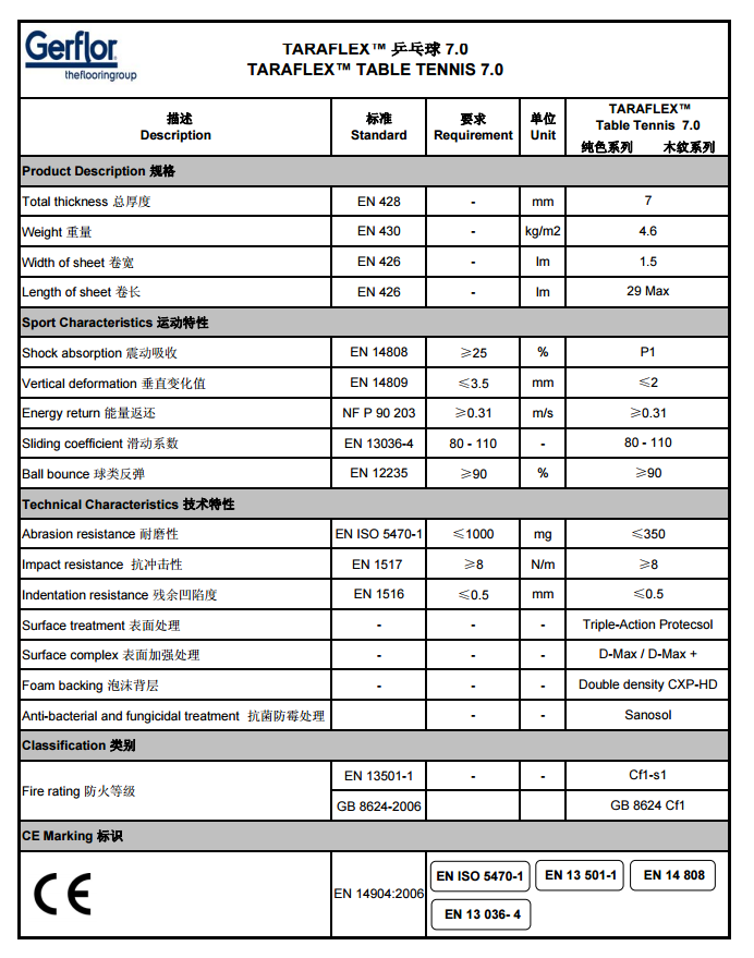 Taraflex?乒乓球運動地板的紅色為國際乒聯(lián)指定色。 Taraflex? 乒乓球運動地板是多層 PVC 地面材料,表層為致密輪壓的乙烯基,底層密閉式細胞泡 沫背層,以無紡玻璃纖維網(wǎng)格作為加強材料。 該產(chǎn)品經(jīng)過 Triple-Action Protecsol 處理(防污,防灼熱擦傷,防阻滯且防滑),同時,該產(chǎn)品每層都 經(jīng)過 Sanosol 處理,具有抗菌防霉的優(yōu)點。 乒乓球 7.0 多層輪壓型 7mm 左右厚度的 PVC 地面材料,表層經(jīng)過 D-Max 加強處理,以無紡玻璃纖維網(wǎng)格作為加 強材料,底層為密閉式細胞雙層泡沫背層 XCP(細胞壁超強化處理)。 該地板符合室內(nèi)運動地板的標準 NFP 90 203 和標準 NF EN 14-904。 該產(chǎn)品經(jīng)過處理(防污,防灼熱擦傷,防阻滯且防 滑),同時在過程中,產(chǎn)品每層都進行了 Sanosol 抗菌防霉處理。
