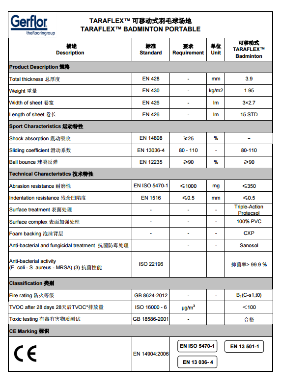 可移動式場地:與法國和國際羽聯(lián)合作研制,研發(fā)**舒適性的可移動式地面材料.Taraflex?羽毛球運動場地由3卷寬度2.7m 長度 16m 的卷材組成可移動的地板,卷材之間接縫 以維可牢連接固定。 Taraflex?羽毛球運動地板表面為輪壓型表層,底層是密閉式細胞泡沫背層,以雙層無紡玻璃纖維 網(wǎng)格作為加強材料。
