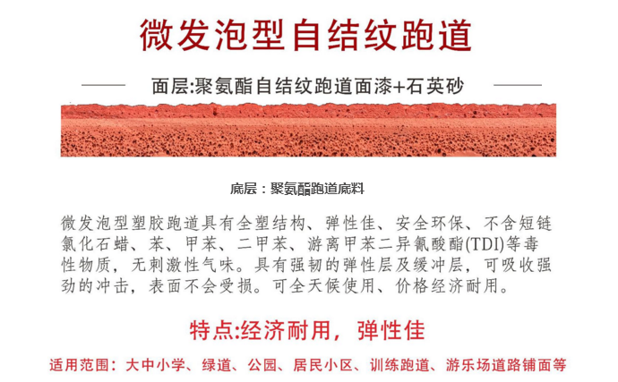 由于產(chǎn)品表面采用顆粒與聚氨脂膠粘劑混合后噴涂,不會(huì)產(chǎn)生脫離現(xiàn)象。表面耐磨性強(qiáng)。能滿(mǎn)足學(xué)*長(zhǎng)時(shí)間,高頻率教學(xué)使用,而且價(jià)格低廉,所以非常適合中小*校鋪設(shè)。
