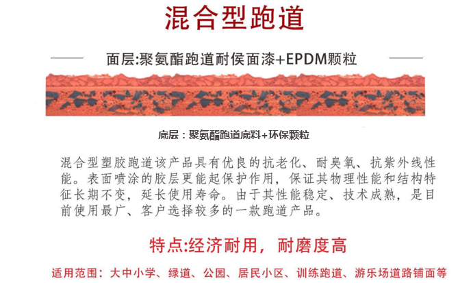 混合型塑膠跑道主要應(yīng)用為室外田徑跑道及田徑運動場地內(nèi)半圓區(qū)。適合于各級比賽、**教學(xué)、訓(xùn)練等跑道場地。要求攤鋪在瀝青基礎(chǔ)之上,鋪設(shè)粘結(jié)牢固、壽命長。較為通用。